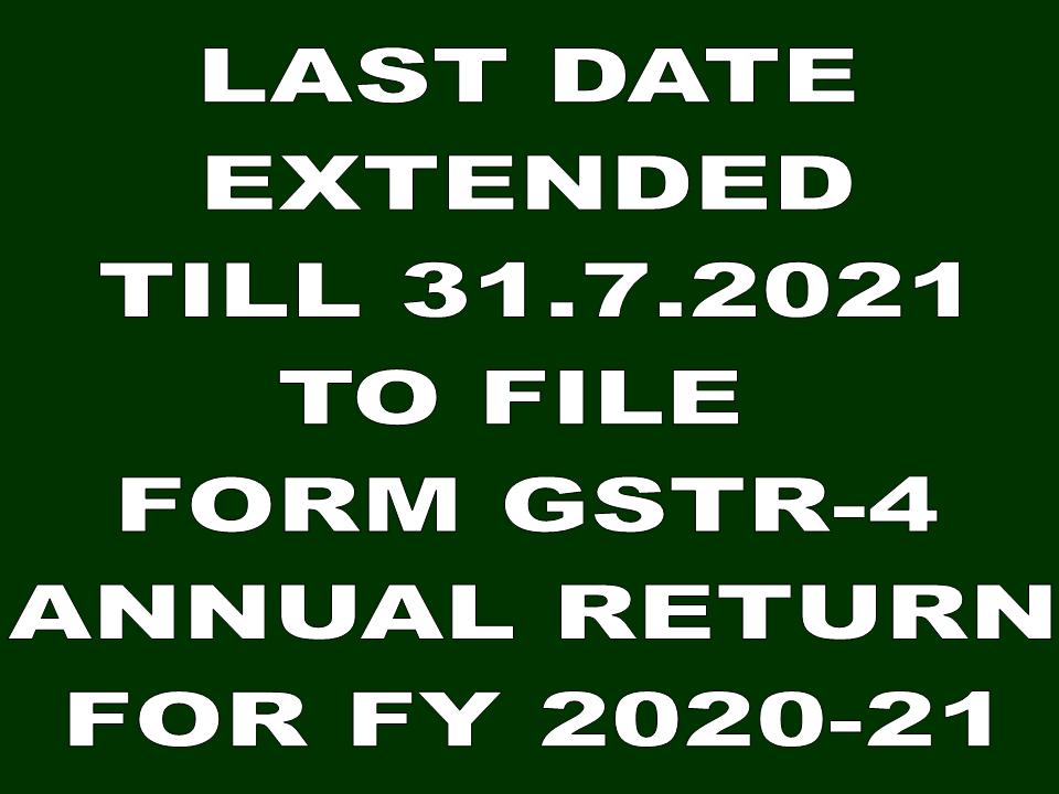 EXTENSION OF LAST DATE TILL 31.7.2021 TO FILE ANNUAL RETURN IN FORM GSTR-4 FOR THE YEAR 2020-21 BY COMPOSITION OPTED PERSONS
